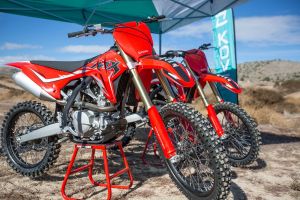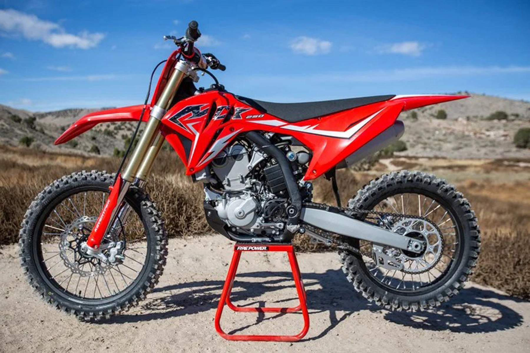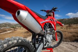 Die Bremskraft kommt von einer schwimmend gelagerten Vorderradbremsscheibe mit 2-Kolben-Bremssattel und einer Hinterradbremsscheibe mit 1-Kolben-Bremssattel, die für sanftes, kontrollierbares Bremsen sorgt. Montiert auf einem 90/90-21-Vorderreifen und einem 110/90-19-Hinterreifen, sorgen der 38,5°-Lenkwinkel und der 28°-Vorlauf des MX450 für messerscharfes Handling und sofortiges Einlenken auf engen Trails und bei rasanten Fahrten gleichermaßen.